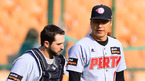 [OSEN=부산,박준형 기자] 9일 오후 부산 사직구장에서 열린 '마구마구 매니저 아시아시리즈 2012' B조 예선 요미우리 자이언츠(일본)와 퍼스 히트(호주)의 경기 8회말 구대성이 산미구엘 포수와 이야기를 나누고 있다 정규시즌 2승