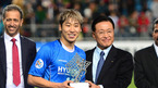 [OSEN=울산 ,백승철 기자] 10일 오후 울산 문수축구경기장에서 열린 '2012 아시아축구연맹(AFC) 챔피언스리그' 결승전 울산 현대와 알 아흘리(사우디아라비아)와의 경기 종료 후 결승전 MVP를 수상한 곽태휘가정몽규 프로축구총재와