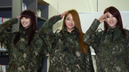 [OSEN=파주, 곽영래 기자] 22일 오후 경기도 파주 1사단 전방대대에서 진행된 '나인뮤지스 군부대 쇼케이스 기자간담회'에서 나인뮤지스 은지, 경리, 현아가 하고 경례를 하고 있다. 군 부대 관련 행사에서 초청 가수 섭외 1순위를