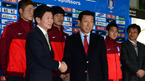 [OSEN=인천공항, 지형준 기자] 한국축구대표팀이 크로아티아와의 평가전을 위해 30일 오전 인천공항을 통해 영국 런던으로 출국했다. 정몽규 회장이 최강희 감독과 악수를 하며 격려하고 있다. 이날 대표팀은 최강희 감독을 비