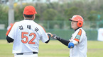 [OSEN=오키나와, 민경훈 기자] 29일 일본 오키나와 고친다 구장에서 진행된 한화 이글스 2013 오키나와 전지훈련에서 라이브게임 중 오선진이 안타를 날린 후 1루에서 1루수 김태균과 하이파이브를 하고 있다. 이번 오키나와 전지