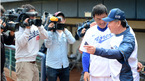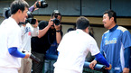 [OSEN=도류(대만), 지형준 기자] 2013 월드베이스볼클래식(WBC 2013) 대한민국 대표팀이 19일 오전 대만 자이현 도류구장에서 훈련을 가졌다. NC와의 연습경기에 앞서 이호준과 대표팀 이진영이 인사를 나누며 이호준이 이진영의 머리