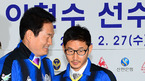 [OSEN=인천, 민경훈 기자] 27일 오후 인천 남동구 인천광역시청 로비에서 인천유나이티드 프로축구단 이천수 선수 입단식이 열렸다. 입단식에서 김남일과 설기현이 박수를 보내고 있다. 이날 입단식에는 송영길 인천시장과 김봉