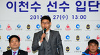 [OSEN=인천, 민경훈 기자] 27일 오후 인천 남동구 인천광역시청 로비에서 인천유나이티드 프로축구단 이천수 선수 입단식이 열렸다. 이천수가 인사말과 소감을 말하고 있다. 이날 입단식에는 송영길 인천시장과 김봉길 감독, 김