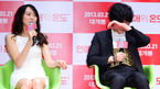 [OSEN=민경훈 기자] 28일 오전 서울 광진구 롯데시네마 건대입구에서 열린 배우 이민기, 김민희 주연의 영화 ‘연애의 온도’(감독 노덕)의 제작보고회에서 김민희의 말에 이민기가 환하게 웃고 있다. '연애의 온도'는 3년차 비밀