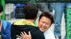 [OSEN=타이중(대만), 지형준 기자] NC 다이노스가 28일 오후 대만 타이중 인터컨티넬탈구장에서 월드베이스볼클래식(WBC) 대만 대표팀과 연습경기를 가졌다. 경기에 앞서 NC 김경문 감독이 더그아웃으로 찾은 박찬호와 인사를 나누