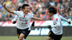[OSEN=서울월드컵경기장,이대선 기자] 2일 서울 성산동 서울월드컵경기장에서 열린 '2013 K리그 클래식' 개막전 FC 서울과 포항 스틸러스의 경기, 후반전 동점골을 성공시킨 포항 이명주가 동료들과 환호하고 있다. '디펜딩 챔피언'