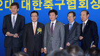 [OSEN=곽영래 기자] 7일 오후 서울 신문로 축구회관에서 진행된 '제52대 정몽규 대한축구협회장의 취임식'에서 대한축구협회 정몽규 회장이 (좌측부터) 전임 김재한 부회장, 조중연 회장, 노흥섭 전 부회장, 최태열 부회장에게 공