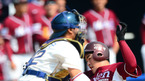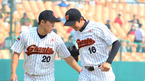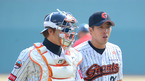 [OSEN=사직,박준형 기자] 9일 부산 사직구장에서 열린 '2013 한국야쿠르트 세븐 프로야구' 롯데 자이언츠와 SK 와이번스의 시범경기 , 1회초 만루위기를 넘긴 김승회가 용덕한 포수와 이야기를 나누며 더그아웃으로 들어가고 있다
