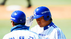 [OSEN=사직,박준형 기자] 10일 부산 사직구장에서 열린 '2013 한국야쿠르트 세븐 프로야구' 롯데 자이언츠와 SK 와이번스의 시범경기 , 1회초 만루 위기를 넘긴 롯데 송승준 선발투수가 용덕한 포수와 이야기를 나누며 더그아웃으로