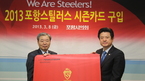 [OSEN=이균재 기자] 포항시의회가 올해 포항스틸러스의 선전을 기원하며 이칠구 시의회의장을 비롯한 시의원 32명 전원이 포항 시즌카드를 구입했다. 포항시의회 의원 32명과 장성환 포항 사장이 참석한 가운데 8일 오전 포항시