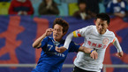 [OSEN=수원,박준형 기자] 13일 오후 경기 수원월드컵경기장에서 열린 AFC 챔피언스리그(ACL) 조별 예선 H조 수원 삼성과 귀저우 런허(중국)의 경기, 전반 수원 홍철이 런허 공격수와 몸싸움을 펼치고 있다 수원은 지난 2월 27일 센트