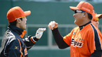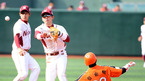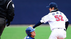 [OSEN=목동 ,박준형 기자] 14일 오후 서울 목동구장에서 열린 '2013 한국야쿠르트 세븐 프로야구' 넥센 히어로즈와 한화 이글스의 경기, 4회말 2사 1루 넥센 조중근의 타구를 잡으며 이닝을 끝낸 한화 김태균 1루수가 동료들의 축하