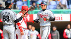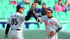 [OSEN=문학,박준형 기자] 15일 오후 인천 문학구장에서 열린 ‘2013 한국야쿠르트 세븐 프로야구’SK 와이번스와 LG 트윈스의 시범경기, 5회초 1사 1루 LG 오지환이 선취 2점 홈런을 날리고 최태원 코치와 하이파이브를 하고 있다 이