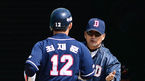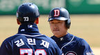[OSEN=광주 ,백승철 기자] 16일 오후 광주구장에서 열린 '2013 한국야쿠르트 세븐 프로야구' KIA 타이거즈와 두산 베어스의 시범경기 3회초 2사 1,2루 허경민의 1타점 적시타에 홈을 밟은 2루주자 최재훈이 덕아웃에서 김진욱 감독과