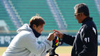 [OSEN=잠실, 민경훈 기자]23일 오후 잠실구장에서‘2013 한국야쿠르트 세븐 프로야구’ LG 트윈스와 두산 베어스의 시범경기가 열릴 예정인 가운데 양 팀이 훈련하는 시간을 가졌다. 경기 전 LG 김기태 감독이 두산 홍성흔을 만나