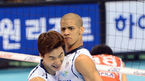 [OSEN=대전,박준형 기자] 24일 오후 대전 충무체육관서 열린 NH농협 2012~2013 V-리그 남자부 챔피언결정전 1차전 경기, 3세트 레오가 공격 성공후 박철우와 포옹을 하고 있다. 6년 연속 우승에 도전하는 삼성화재와 2년 연속 우승의 꿈