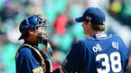 [OSEN=문학, 민경훈 기자] 24일 오후 인천 문학구장에서 ‘2013 한국야쿠르트 세븐 프로야구’ SK 와이번스와 NC 다이노스의 시범경기가 열렸다. 5회초 SK 조인성 되신 교체 투입된 박경완이 김준과 볼을 주고 받고 있다. 이 날 경기