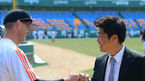 [OSEN=대전,박준형 기자] 24일 오후 대전구장에서 열린 '2013 한국야쿠르트 세븐 프로야구' 한화 이글스와 롯데 자이언츠의 시범경기, 경기에 앞서 박재홍 해설위원이 롯데 옥스프링과 인사를 나누고 있다 지난 23일 롯데와 한화의