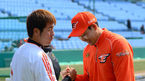 [OSEN=대전,박준형 기자] 24일 오후 대전구장에서 열린 '2013 한국야쿠르트 세븐 프로야구' 한화 이글스와 롯데 자이언츠의 시범경기, 경기에 앞서 롯데 강민호와 한화 김태완이 인사를 나누고 있다 지난 23일 롯데와 한화의 시범경