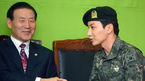[OSEN=정송이 기자] 27일 오전 서울지방병무청 대회의실에서 진행된 '제 10대 병무홍보대사 위촉식'에서 박창명 병무청장과 이특이 악수를 나누고 있다. 이상철(상추), 박정수(이특) 홍보대사는 일일 명예 징병관으로 활동 하는