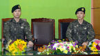 [OSEN=정송이 기자] 27일 오전 서울지방병무청 대회의실에서 진행된 '제 10대 병무홍보대사 위촉식'에서 상추와 이특이 박창명 서울병무청장 인사말을 듣고 있다. 이상철(상추), 박정수(이특) 홍보대사는 일일 명예 징병관으로 활