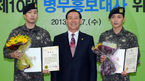 [OSEN=정송이 기자] 27일 오전 서울지방병무청 대회의실에서 진행된 '제 10대 병무홍보대사 위촉식'에서 상추, 박창명 서울병무청장, 이특이 포토타임을 갖고 있다. 이상철(상추), 박정수(이특) 홍보대사는 일일 명예 징병관으로