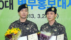 [OSEN=정송이 기자] 27일 오전 서울지방병무청 대회의실에서 진행된 '제 10대 병무홍보대사 위촉식'에서 상추와 이특이 포토타임을 갖고 있다. 이상철(상추), 박정수(이특) 홍보대사는 일일 명예 징병관으로 활동 하는 등 병무 홍