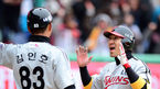 [OSEN=인천,지형준 기자] 30일 오후 인천 문학구장에서 2013 한국야쿠르트 세븐프로야구 SK 와이번스와 LG 트윈스의 개막전이 열렸다. 8회초 1사 만루에서 LG 정성훈이 역전 만루홈런을 날리고 기뻐하는 반면 SK 이재영과 최정이 아쉬