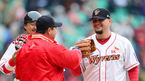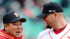 [OSEN=인천,지형준 기자] 30일 오후 인천 문학구장에서 2013 한국야쿠르트 세븐프로야구 SK 와이번스와 LG 트윈스의 개막전이 열렸다. 8회초 1사 1루에서 SK 선발 레이예스가 이만수 감독과 하이파이브를 하며 마운드를 내려가고 있