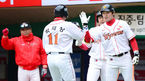 [OSEN=대구, 이대선 기자] 30일 오후 대구시민운동장 야구장에서 2013 한국야쿠르트 세븐프로야구 삼성 라이온즈와 두산 베어스의 개막전이 열렸다. 1회초 2사 만루 두산 오재원이 좌월 만루 홈런을 날리고 조원우 코치와 하이파