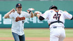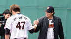 [OSEN=부산 ,백승철 기자] 30일 오후 부산 사직구장에서 열린 '2013 한국야쿠르트 세븐 프로야구' 롯데 자이언츠와 한화 이글스의 경기 시작 전 조진웅이 시구를 마치고 강민호와 세리머니를 하고 있다. 이날 사직구장에서 열리는