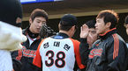 [OSEN=부산 ,백승철 기자] 31일 오후 부산 사직구장에서 열린 '2013 한국야쿠르트 세븐 프로야구' 롯데 자이언츠와 한화 이글스의 경기 8회초 2사 만루 대타 이양기를 삼진으로 처리한 정대현이 덕아웃으로 향하며 동료들의 격려를