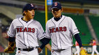 [OSEN=잠실, 최규한 기자] 2일 오후 서울 잠실야구장에서 '2013 한국야쿠르트 세븐프로야구' 두산 베어스 대 SK 와이번스의 경기가 열렸다. 5회초 SK 공격을 무실점으로 마무리 지은 두산 선발 노경은과 김현수가 더그아웃으로 들어