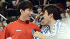 [OSEN=잠실학생체, 곽영래 기자] 3일 오후 잠실학생체육관에서 열린 '2012-2013 KB국민카드 프로농구 4강 PO 2차전' 서울 SK와 안양 KGC의 경기 3쿼터 KGC 오세근과 양희종이 점수차가 벌어지자 즐거운 미소를 짓고 있다. SK는 5전 3선승제