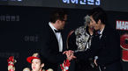 [OSEN= 최규한 기자] 4일 오후 서울 영등포 타임스퀘어에서 진행된 영화 '아이언맨3' 레드카펫 행사에서 로버트 다우니 주니어가 타이거JK-윤미래의 아들 조단에게 생일 축하 꽃다발을 건네받고 있다. '아이언맨3'(감독 셰인 블랙)