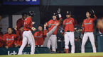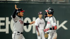 [OSEN=잠실,박준형 기자] 4일 오후 서울 잠실구장에서 열린 2013 한국야쿠르트 세븐 프로야구 두산 베어스와 SK 와이번스의 경기, 7회초 1사 3루 SK 최정의 타석, 두산 투수 윤명준의 폭투때 홈을 밟은 이명기가 동료들의 축하를 받고