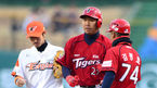 [OSEN=대전, 이대선 기자] 4일 오후 대전 한밭종합운동장 야구장에서 열린 2013 한국야쿠르트 세븐프로야구 한화 이글스와 KIA 타이거즈의 경기, 1회초 1사 1,2루에서 KIA 이범호가 중전 적시타를 치고 김평호 코치와 하이파이브를 하