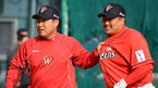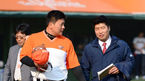 [OSEN=대전, 이대선 기자] 4일 오후 대전 한밭종합운동장 야구장에서 열린 2013 한국야쿠르트 세븐프로야구 한화 이글스와 KIA 타이거즈의 경기, 경기에 앞서 한화 김태균과 박재홍 MBC스포츠플러스 해설위원이 이야기를 나누고 있