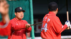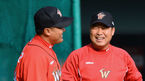 [OSEN=잠실,박준형 기자] 4일 오후 서울 잠실구장에서 열리는 2013 한국야쿠르트 세븐 프로야구 두산 베어스와 SK 와이번스의 경기, 경기에 앞서 SK 이만수 감독이 조인성에게 전날 타격에 대한 응징하고 있다. 두산은 우완 김상현