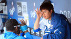 [OSEN=캘리포니아 로스앤젤레스, 민경훈 기자] 8일 새벽(이하 한국시간) 미국 캘리포니아 로스앤젤레스 다저스타디움에서 열린 LA 다저스와 피츠버그 파이어리츠와의 3차전, 경기 전 류현진과 동료들과 장난을 치며 미소 짓고 있