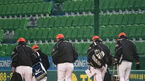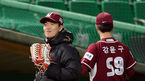 [OSEN=문학, 곽영래 기자] 11일 오후 인천 문학구장에서 열린 '2013 한국야쿠르트 세븐 프로야구' SK 와이번스와 넥센 히어로즈의 경기 넥센 김병현이 강윤구의 투구연습을 보호하기위해 그라운드에 나와있다. SK와의 이전 2경기에