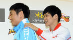 [OSEN=잠실학생체, 정송이 기자] 12일 오전 서울 잠실학생체육관에서 열린 '2012-2013 KBL 챔피언결정전 미디어데이'에서 김선형과 함지훈이 입장하고 있다. 챔피언결정전 미디어데이에는 SK 문경은 감독과 모비스 유재학 감독, SK 김