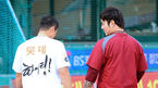 [OSEN=사직,박준형 기자] 16일 오후 부산 사직구장에서 열리는 '2013 한국야쿠르트 세븐 프로야구' 롯데 자이언츠와 넥센 히어로즈의 경기, 경기에 앞서 넥센 박병호가 '찜닭, 힘!'이라는 문구가 새겨진 티셔츠를 입은 황재균과 이