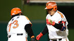 [OSEN=대전, 이대선 기자] 18일 오후 대전 한밭종합운동장 야구장에서 열린 2013 한국야쿠르트 세븐프로야구 한화 이글스와 NC 다이노스의 경기, 4회말 1사 2루에서 한화 김태균이 중월 역전 투런 홈런을 치고 이종범 코치와 하이파