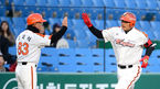 [OSEN=대전, 이대선 기자] 18일 오후 대전 한밭종합운동장 야구장에서 열린 2013 한국야쿠르트 세븐프로야구 한화 이글스와 NC 다이노스의 경기, 2회말 무사에서 한화 김태균이 좌월 솔로 홈런을 치고 오대석 코치와 하이파이브를