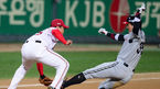 [OSEN=대전, 이대선 기자] 18일 오후 대전 한밭종합운동장 야구장에서 열린 2013 한국야쿠르트 세븐프로야구 한화 이글스와 NC 다이노스의 경기, 7회말 1사 만루에서 한화 오선진의 희생플라이 때 3루주자 김경언이 홈으로 쇄도해