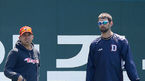 [OSEN=잠실, 곽영래 기자] 21일 오후 서울 잠실야구장에서 열린 '2013 한국야쿠르트 세븐 프로야구' 두산 베어스와 한화 이글스의 경기전 두산 니퍼트와 한화 이브랜드가 이야기를 나누고 있다. 김선우는 올 시즌 2경기 1패 평균자