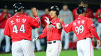 [OSEN=부산 ,백승철 기자] 24일 오후 부산 사직구장에서 열린 '2013 한국야쿠르트 세븐 프로야구' 롯데 자이언츠와 SK 와이번스의 경기 6회초 1사 1,2루 정근우가 스리런포를 친 후 덕아웃에서 동료들과 하이파이브를 하고 있다. 개막