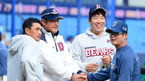 [OSEN=창원, 이대선 기자] 26일 오후 창원 마산야구장에서 열린 2013 한국야쿠르트 세븐프로야구 NC 다이노스와 두산 베어스의 경기, 경기에 앞서 두산 이종욱, 최준석, 김현수가 NC 김광림 코치와 인사를 나누고 있다. NC 다이노스의
